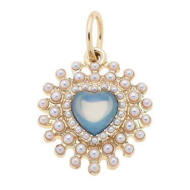 The Bejeweled Pearl Heart Charm in Turquoise & White features a heart design adorned with turquoise and white pearls, adding a touch of elegance and glamour. This charm symbolizes love and beauty.