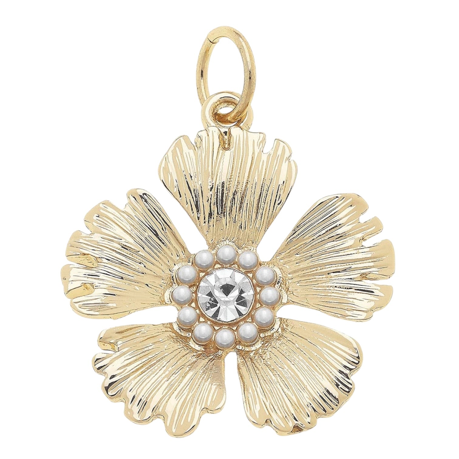 Shine bright with the Rhinestone Flower Charm in shiny gold. This floral charm is adorned with sparkling rhinestones, making it a dazzling and eye-catching piece for any charm collection. Mix & Match and add this charm to our Charm Necklace or Bracelets to show off your unique style.