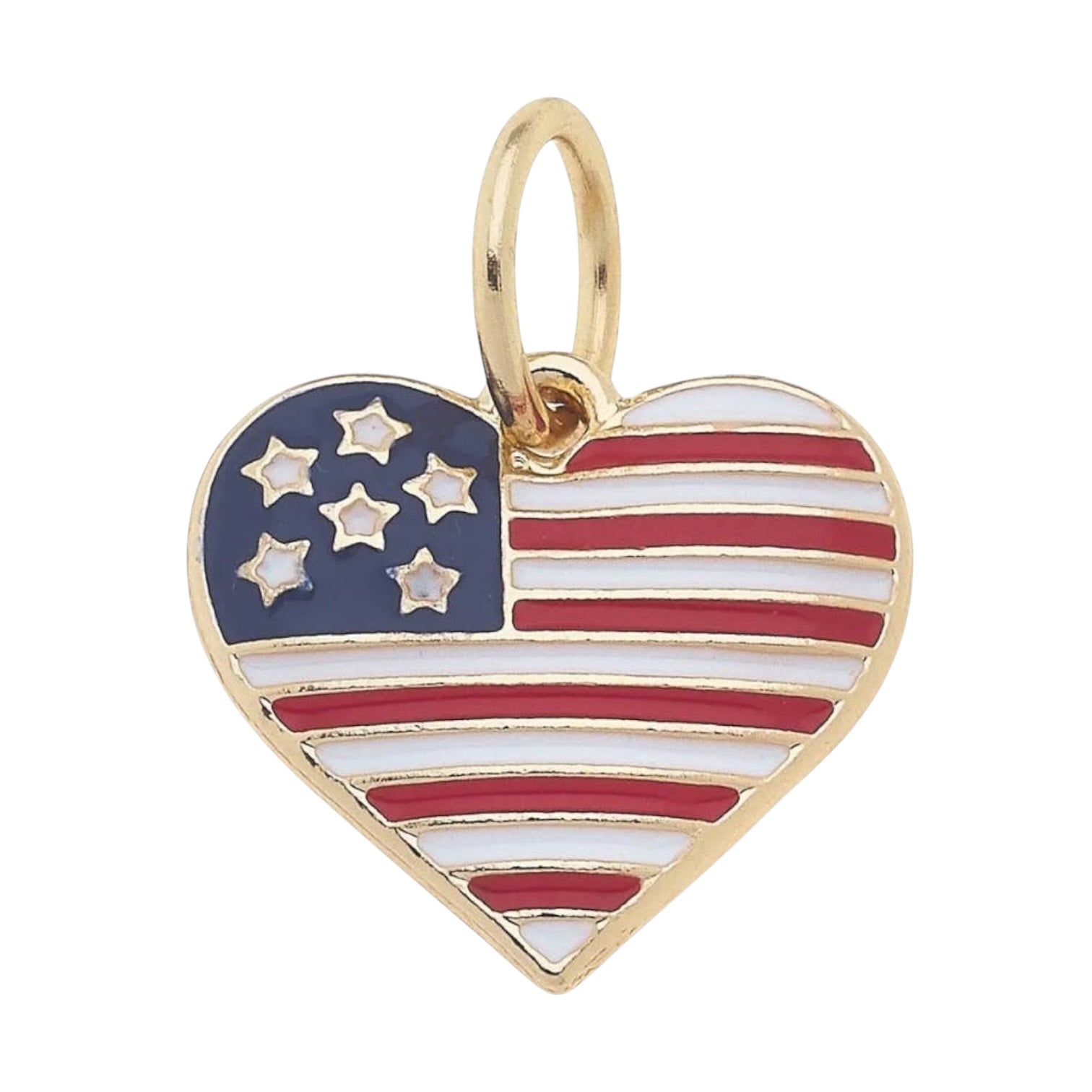 The I Heart America Charm in Red, White, & Blue features a heart design with American flag colors. This patriotic charm is perfect for showcasing your love for the USA, especially during holidays or celebrations.