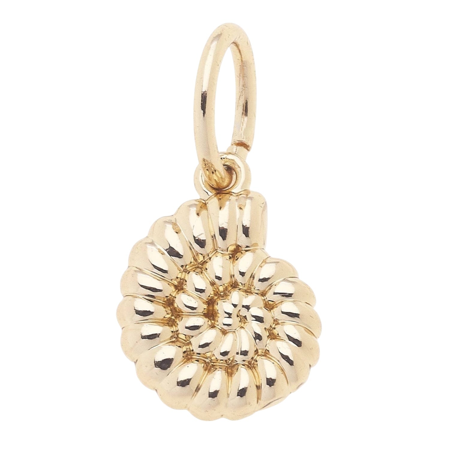 The Mini Spiral Shell Charm in Shiny Gold features a miniature spiral shell in polished gold. This charming piece adds a delicate, ocean-inspired touch to your jewelry.