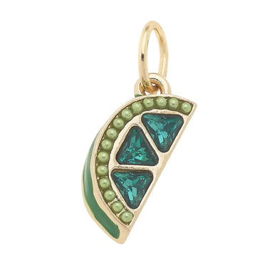 The Pave Lime Wedge Charm in Green features a lime wedge design with pave stone detailing. This charm adds a zesty, vibrant touch to your jewelry collection.