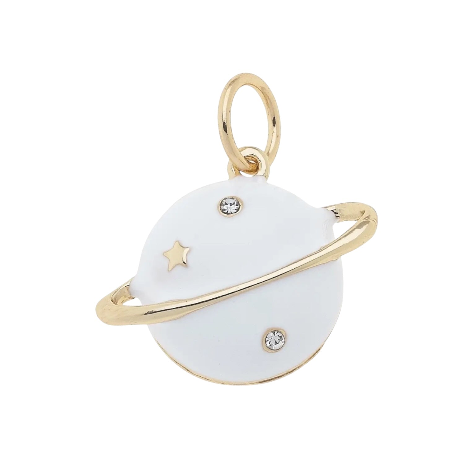 The Saturn Rhinestone Planet Charm in White features a sparkling rhinestone-encrusted Saturn planet with its signature rings. This charm adds a celestial and cosmic vibe to your jewelry collection, perfect for stargazers.