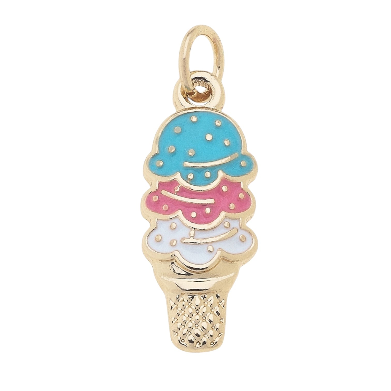 The Triple Scoop Ice Cream Cone Charm in Red, White, & Blue features three colorful scoops of ice cream stacked atop a cone. This charm evokes summer fun and is perfect for celebrating holidays or adding whimsy to your jewelry.