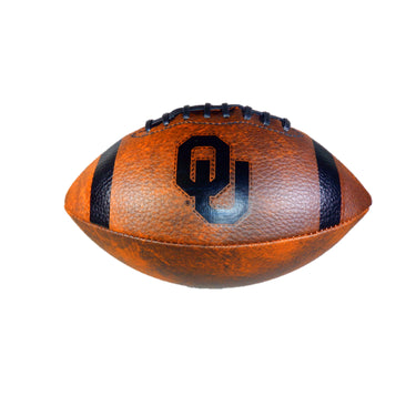 Football is one of America's favorite past-times and this officially licensed 9-inch Vintage Throwback Football is a must have for any young loyal sports fan. It is made of composite leather and features composite leather stitching and a laser stamped OU Logo. The distressed brown color and distinct black stitching makes this football really stand out. Its durable design and construction helps to hold its shape. Perfect size for any young football fan to practice their football skills or during your gameday parties to toss around! This item is manufactured in China and holds 2-4 lbs. of air. Measures 9 inches in length and 5.5 inches in width.