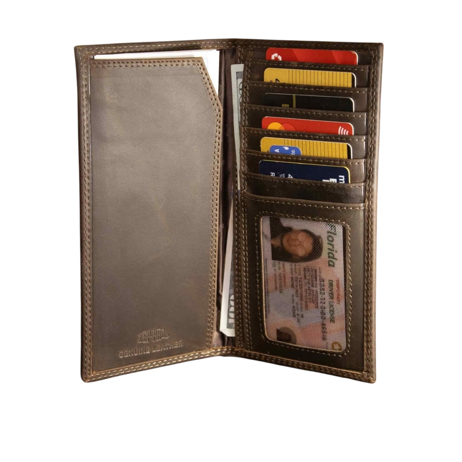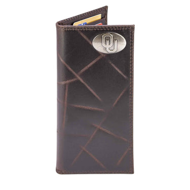 The collegiate leather secretary tall wallet is constructed of full grain leather and features the OU logo, proudly displayed on the front upper right corner. The metal concho emblem has a silver finish which perfectly accents this unique wallet. The tall secretary design provides ample space for cards, ID, and cash, while the leather gives it a natural appearance.