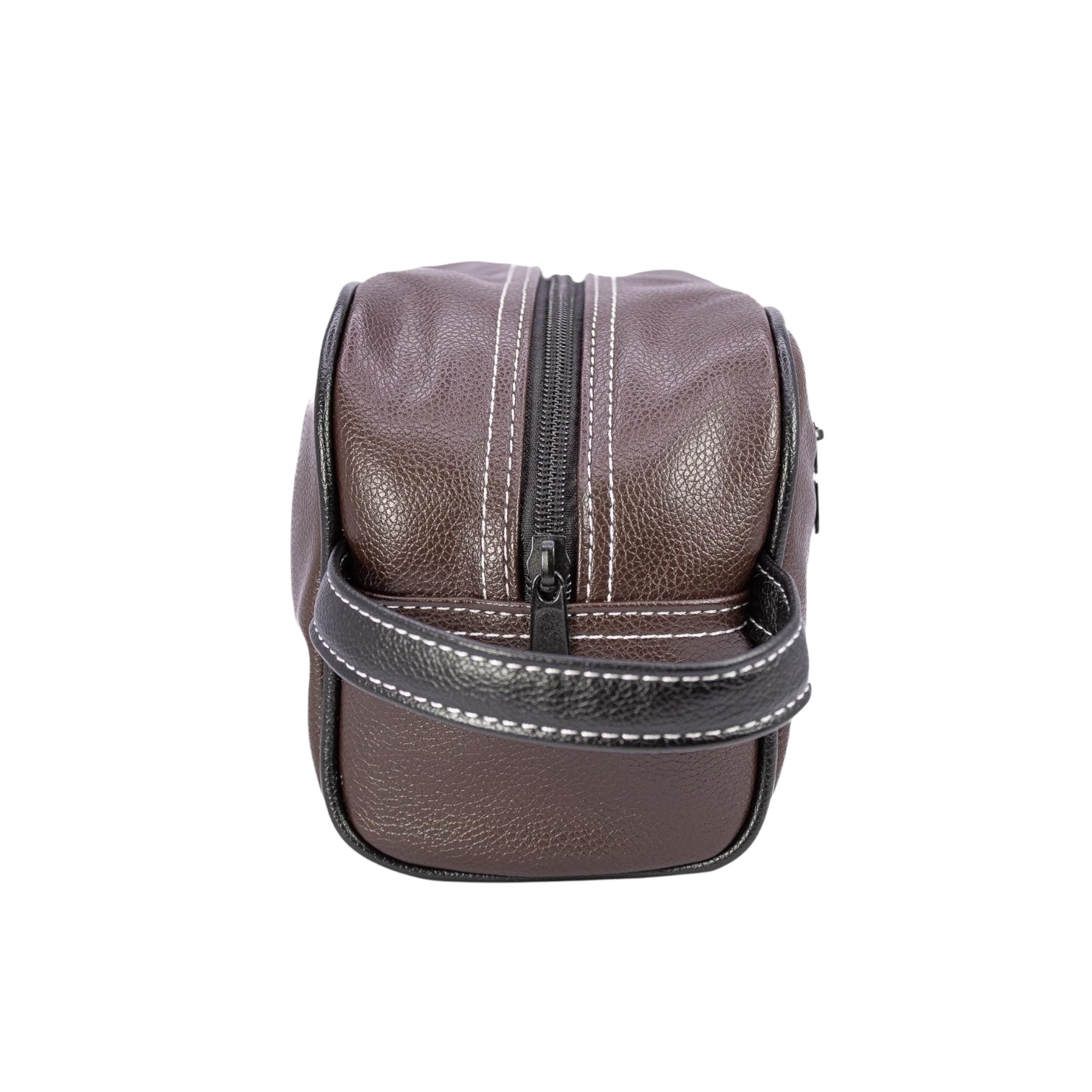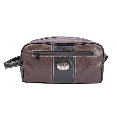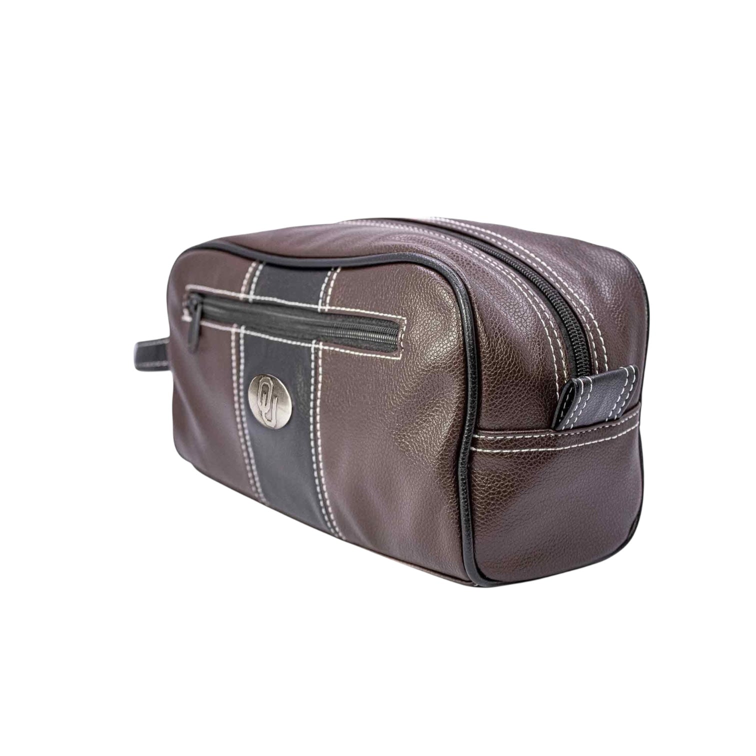 The toiletry Dopp Bag is constructed of soft and sturdy pebble grain PU. An accented silver OU emblem is proudly displayed on the front.