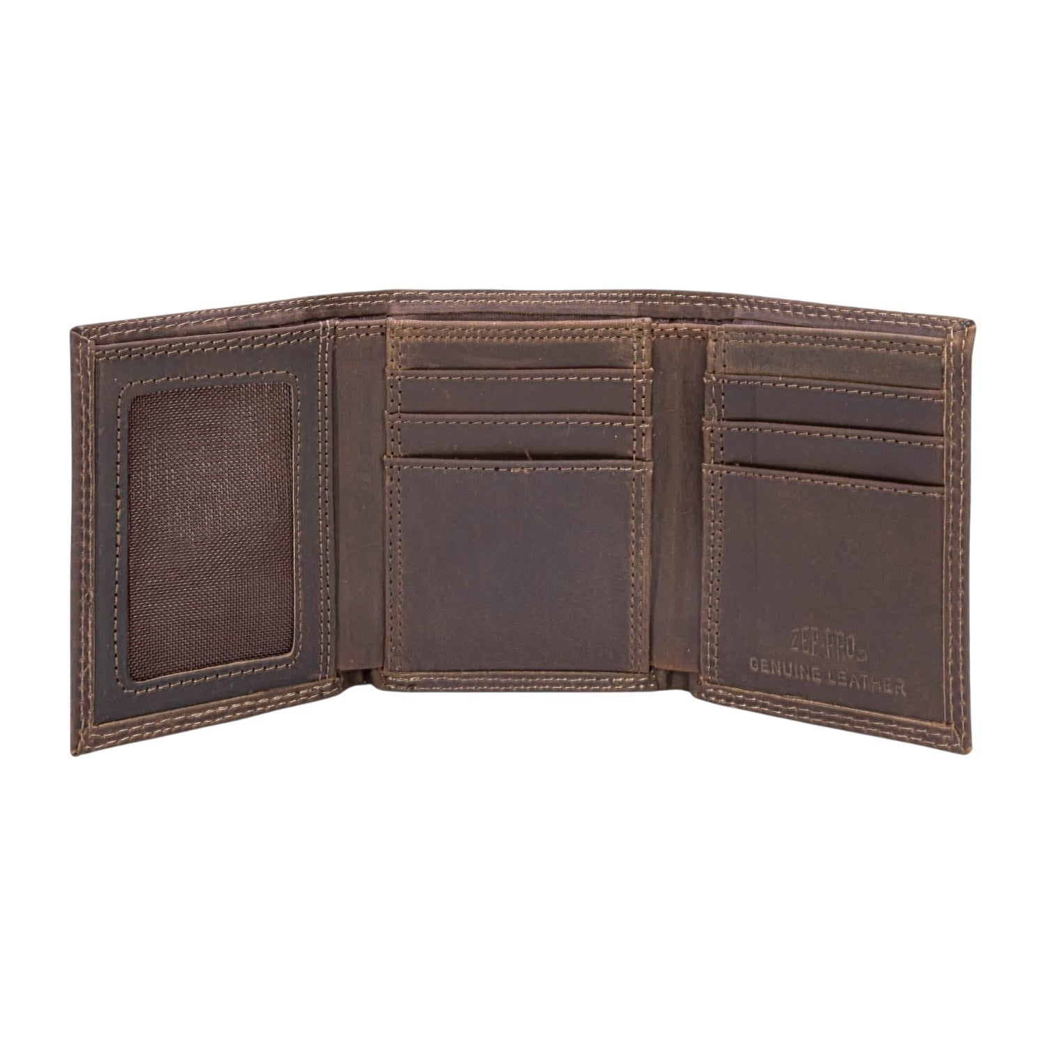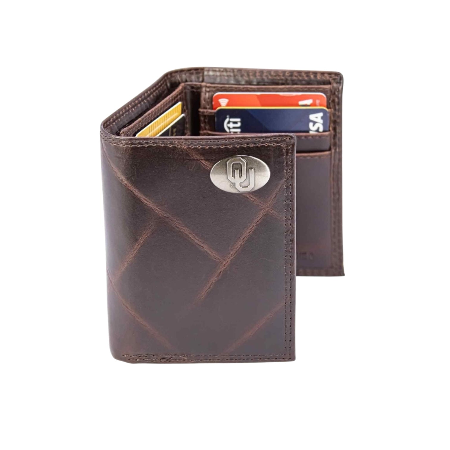 The collegiate leather trifold wallet is constructed of full grain leather and features the OU logo, proudly displayed on the front upper right corner. The metal concho emblem has a silver finish which perfectly accents this unique wallet. The tall secretary design provides ample space for cards, ID, and cash, while the leather gives it a natural appearance.