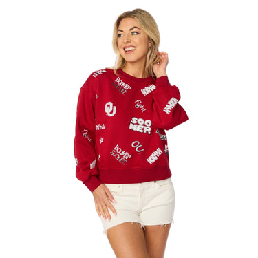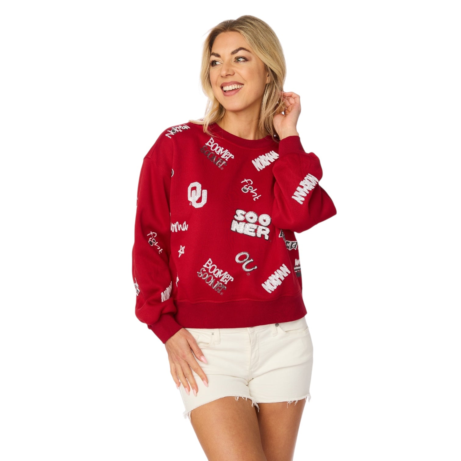 Stand out in the crowd! Full sequin logos and phrases adorn the front and back of this relaxed sweatshirt. Dropped shoulders elevate the look. This top is officially licensed so a portion of your purchase directly supports the university.