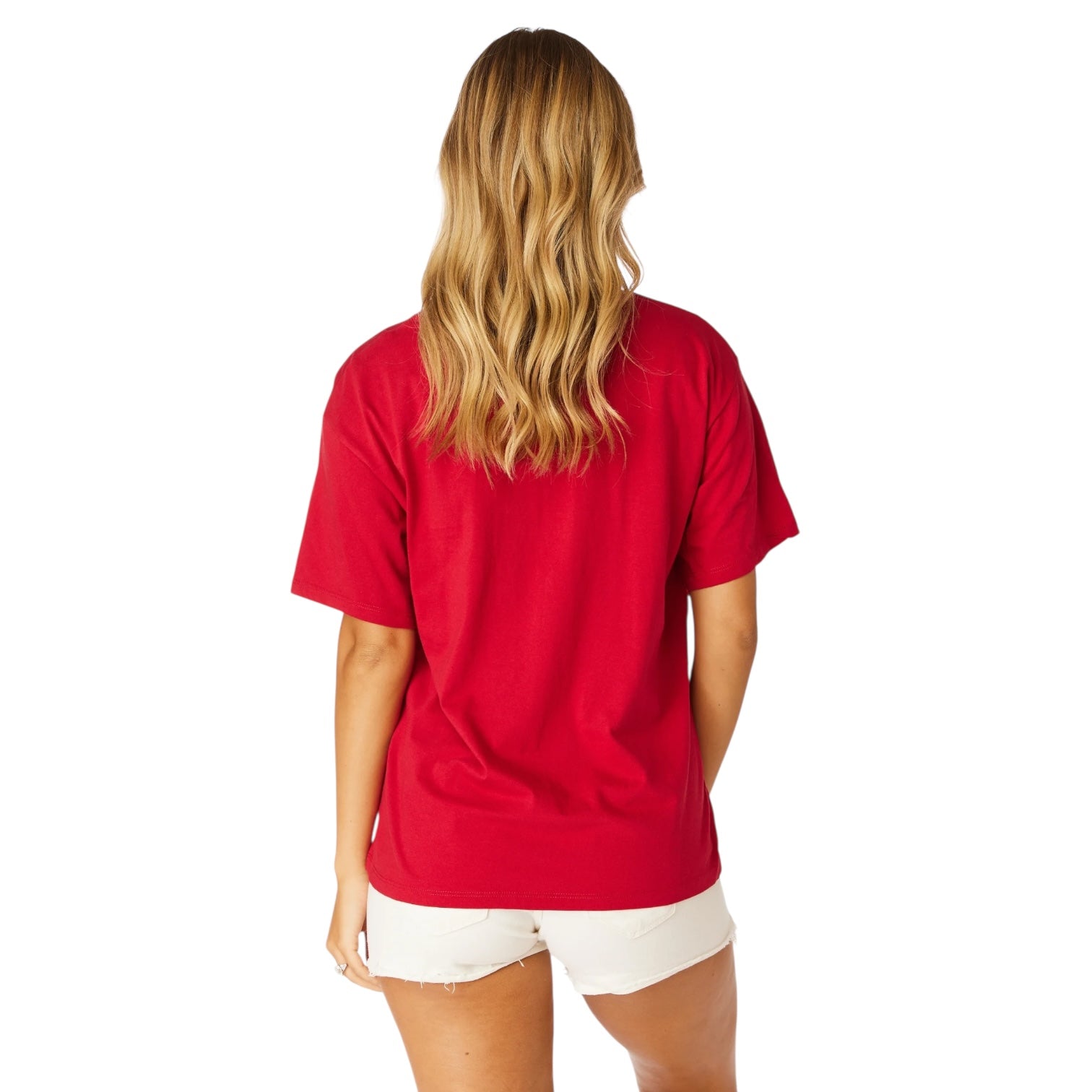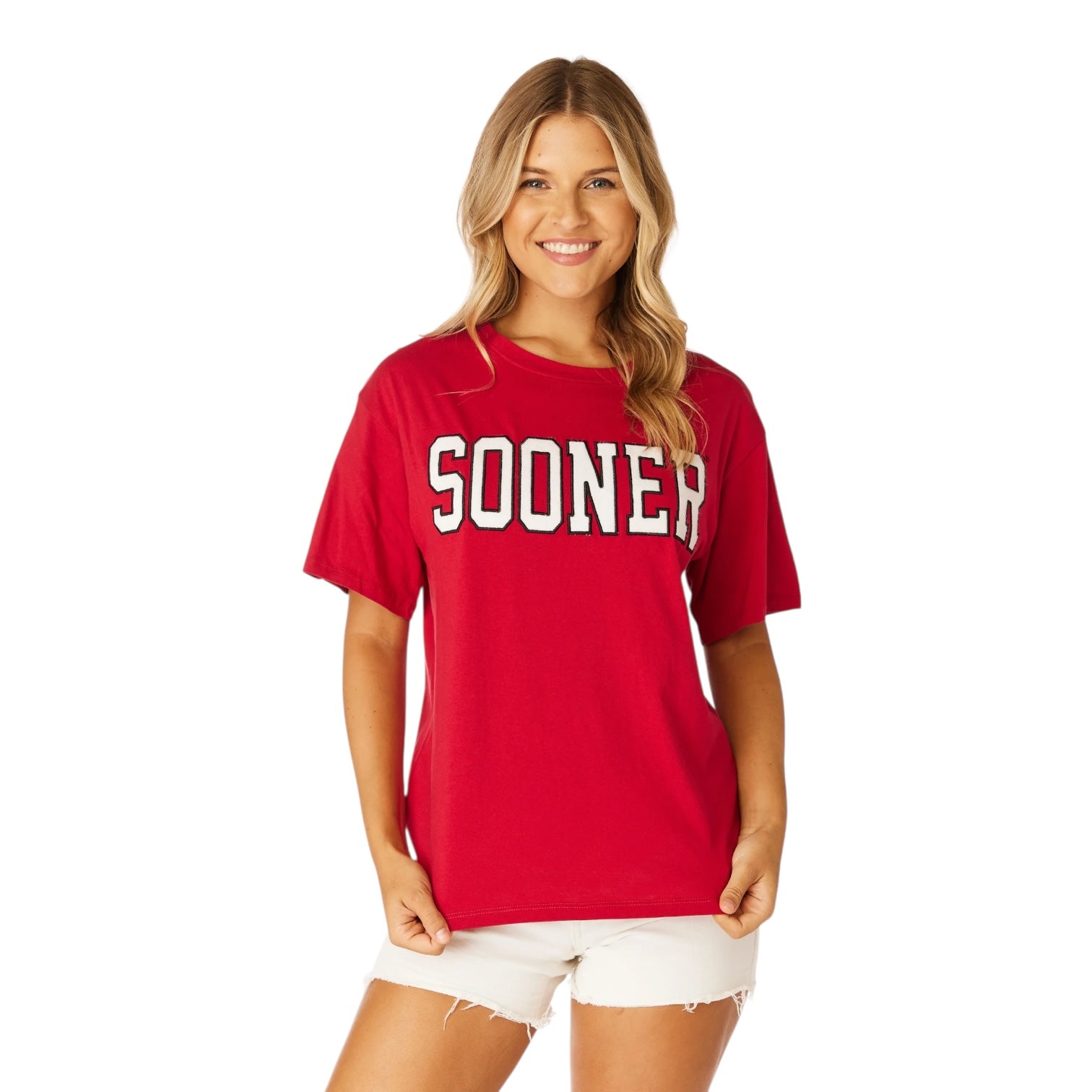Oversized felt letters pop against a solid tee for a classic game day look! The relaxed fit, dropped sleeves, and soft cotton will make this shirt your go-to for all game day gatherings. This top is officially licensed so a portion of your purchase directly supports the university.