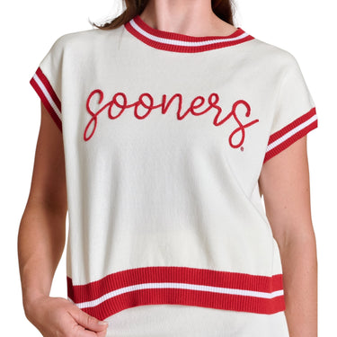 Rope embroidered detailing. Cap sleeve sweater top with team color accents at neck, sleeve, and hemline.