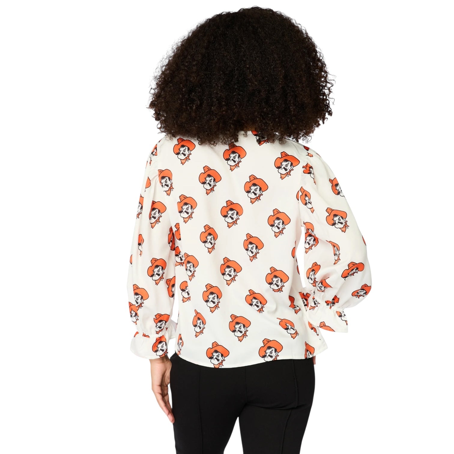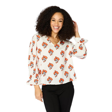This blouse is the best combination of feminine details and a bold print in your team colors.  Featuring a satin fabrication, slight puff sleeve, v-neck, and elastic ruffle at the sleeve for adjustable length, this fun and versatile piece is a must-have that you will wear for seasons to come!