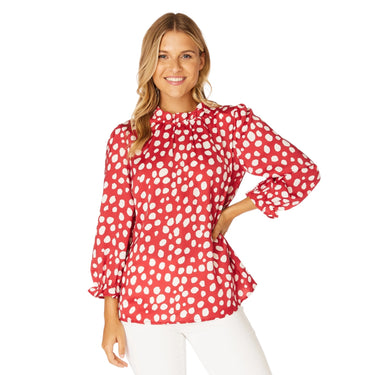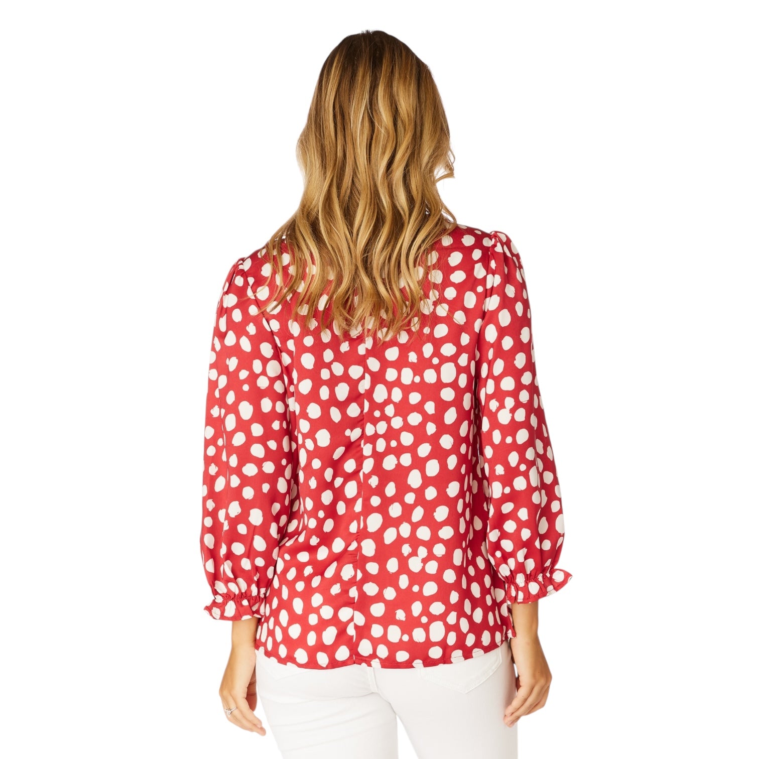 Wear your team colors with pride in our new blouse! This blouse is perfect for the office or game day. It features a frill mock neckline, ¾ sleeve with ruffle hem, and a keyhole closure in the back.