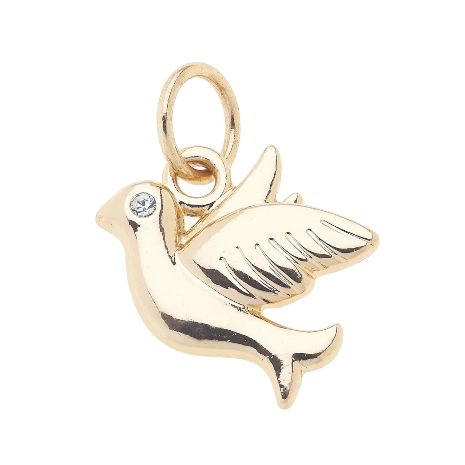 The Dove Bird Charm in Shiny Gold features a delicate dove in polished gold. This charm symbolizes peace and love, making it a meaningful and serene addition to your jewelry.