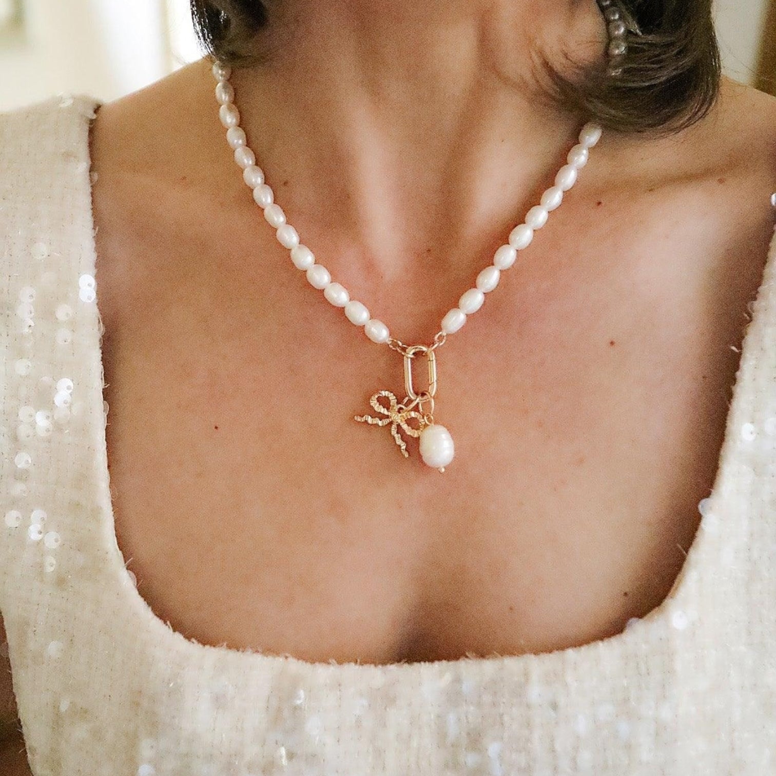 The Piper Freshwater Pearl Charm Necklace Base in ivory offers a classic and timeless look. Its elegant freshwater pearls provide a refined base, ideal for pairing with delicate or bold charms alike. Easily add & remove charms to our necklace bases with our charm holders with hinge closures. Mix & Match charms to show off your unique style.