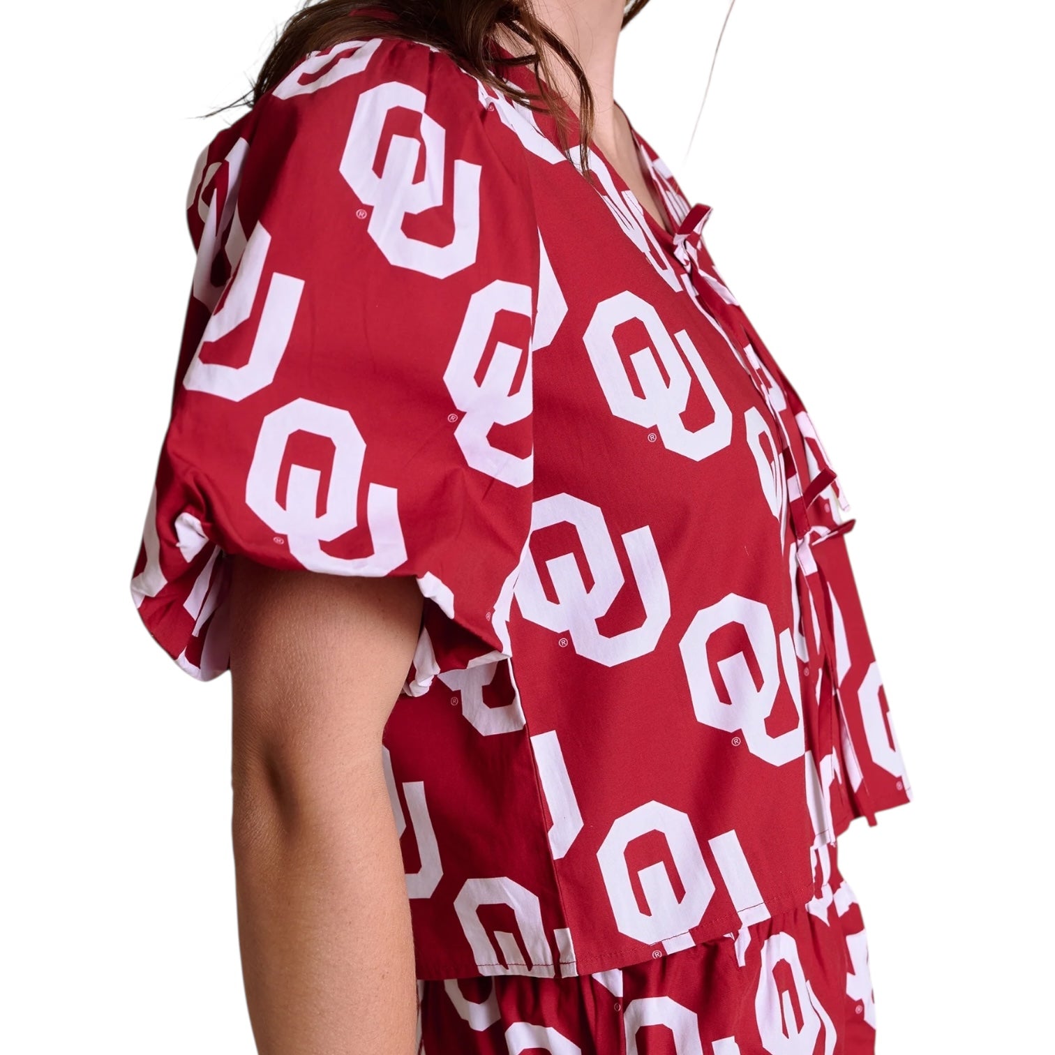 A feminine silhouette with dainty details. This puff-sleeve blouse is an effortless blend of polish and personality — with an allover offset logo print and a faux front tie that adds soft structure. A feminine silhouette that transitions easily from game day to girls’ night. We’re pairing it with our Poplin Skort and platform wedges or denim and a low block heel.