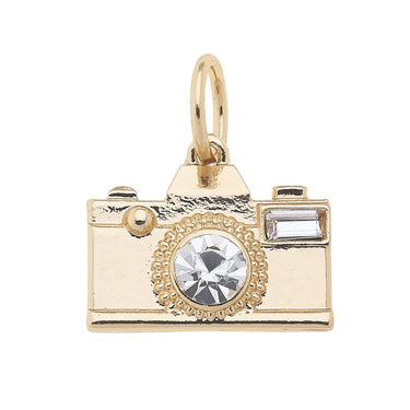 The Rhinestone Camera Charm in Shiny Gold features a vintage camera design encrusted with rhinestones, giving it a sparkling, glamorous touch. This charm is perfect for photography enthusiasts or anyone who loves a bit of sparkle.