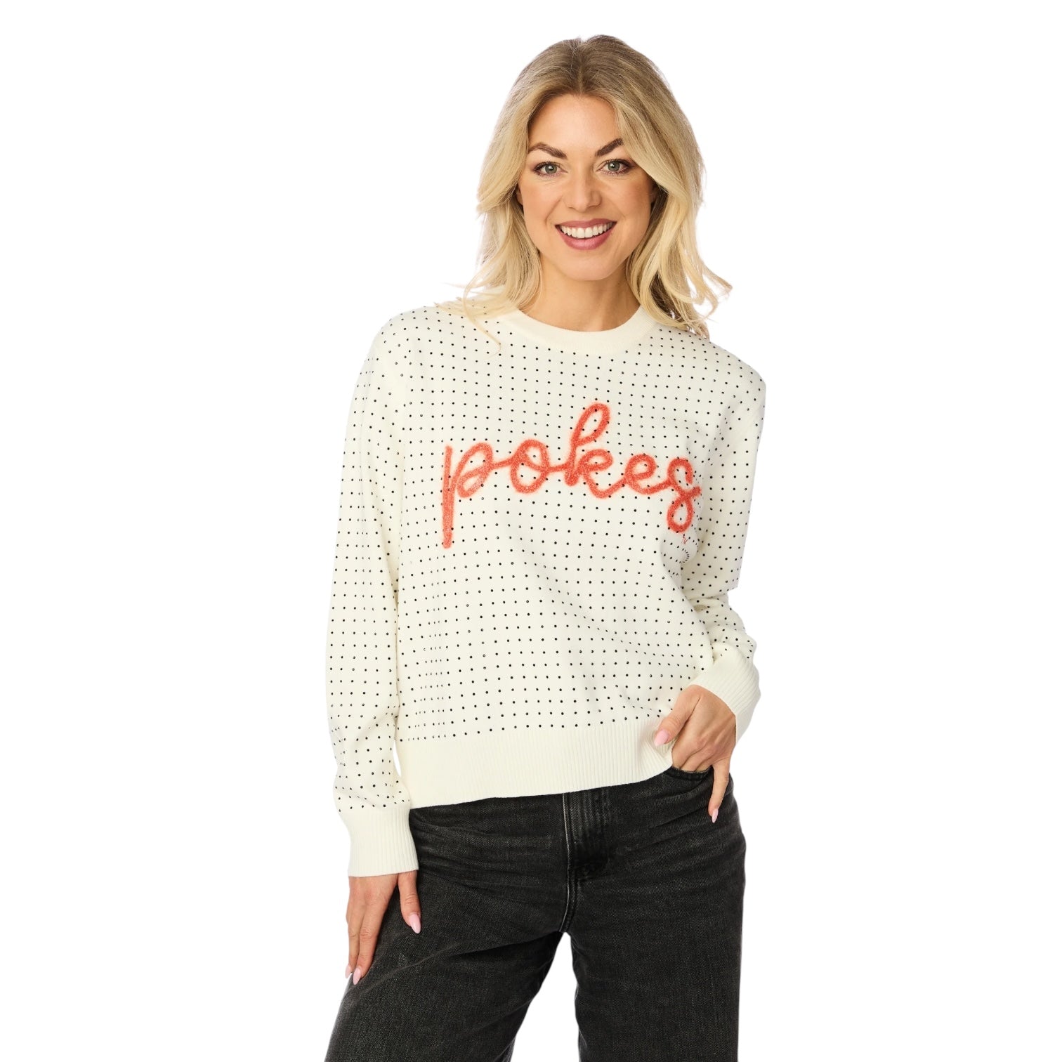 This elevated sweater is the perfect way to dress up game day in the four months. Featuring rhinestone detailing and oversized glitter script, this will quickly become your new fave! This top is officially licensed.