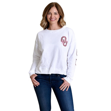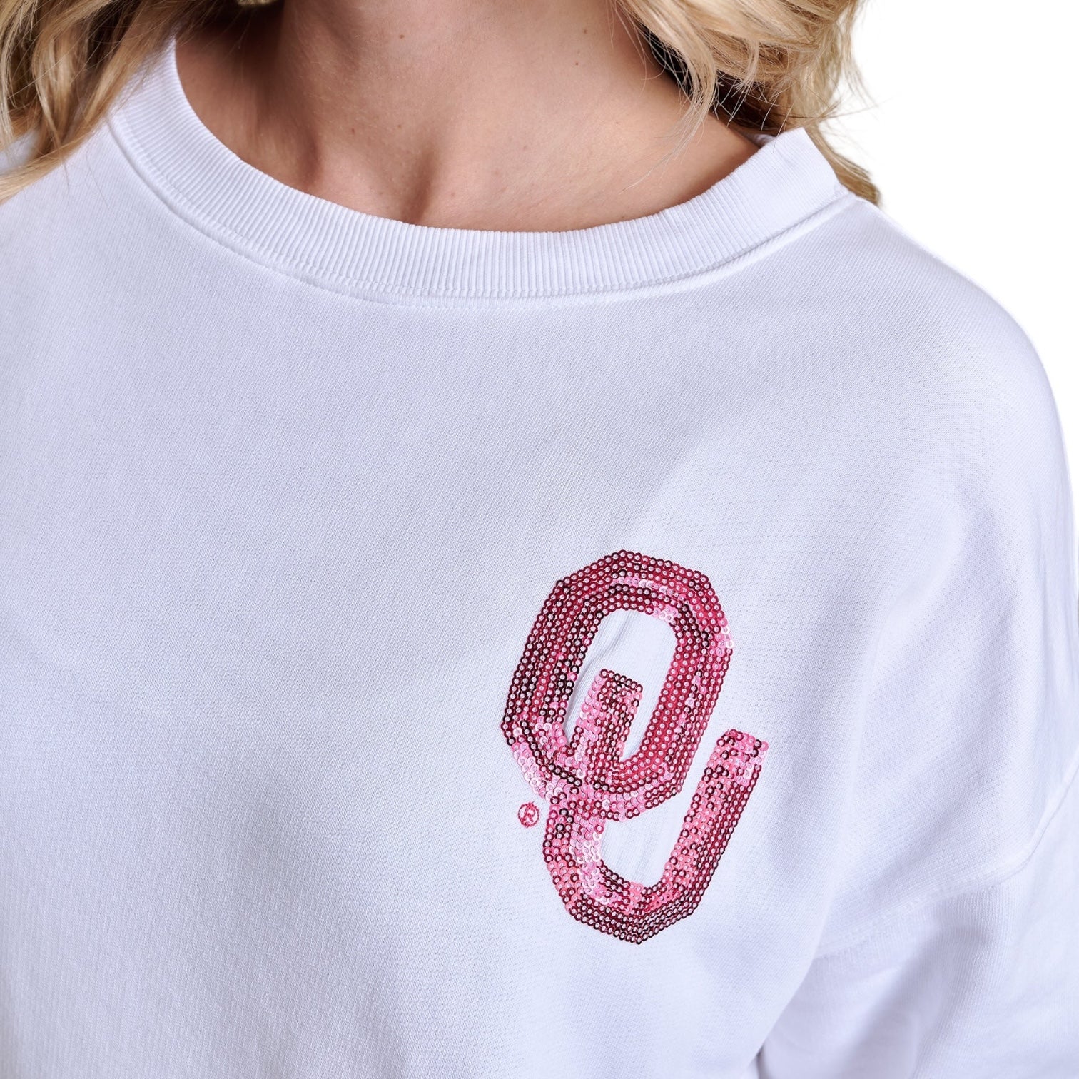 Everyday luxe with unexpected, shimmery details. This oversized crewneck sweatshirt updates a familiar shape with sequin logos at the back and chest, delivering a subtle but eye-catching shimmer. The soft fleece fabric ensures all-day comfort, while the boxy fit adds modern volume. Style with leather leggings and boots for an elevated casual cool.