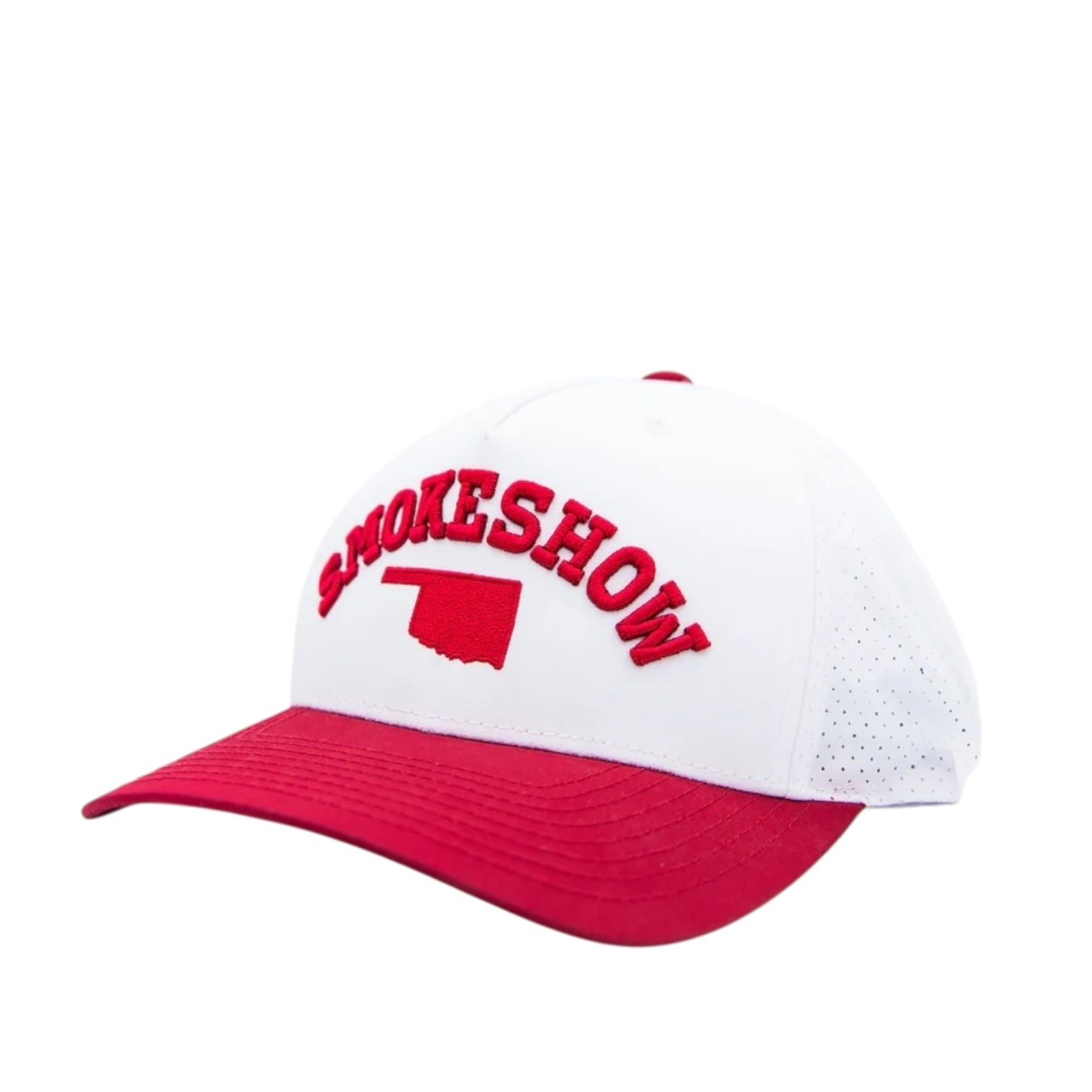 - Crimson and White Performance Sport hat with embroidered Crimson 'SMOKESHOW' with white features and Oklahoma logo.