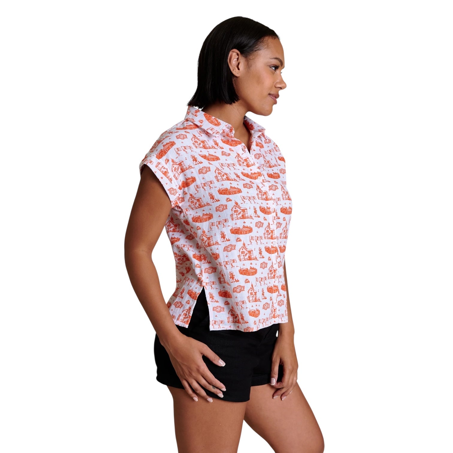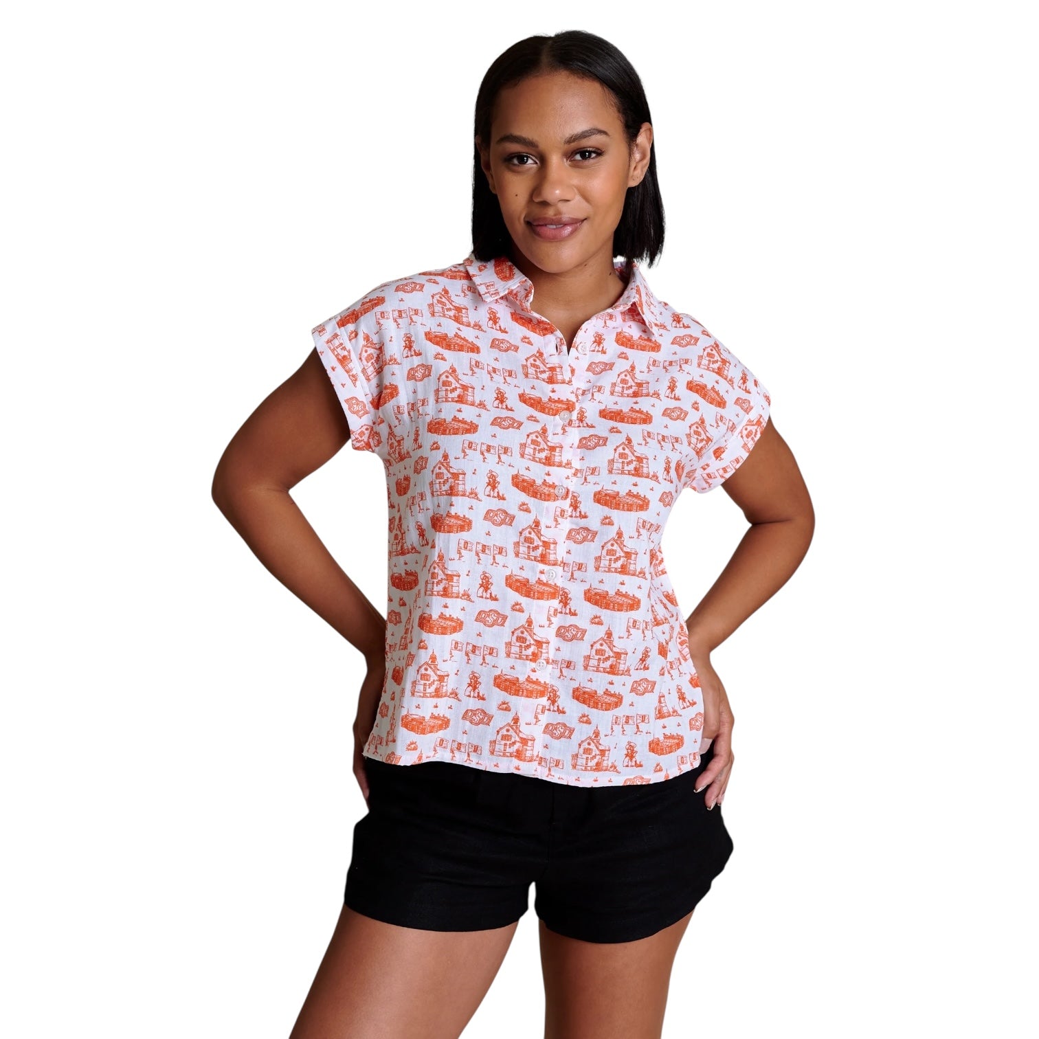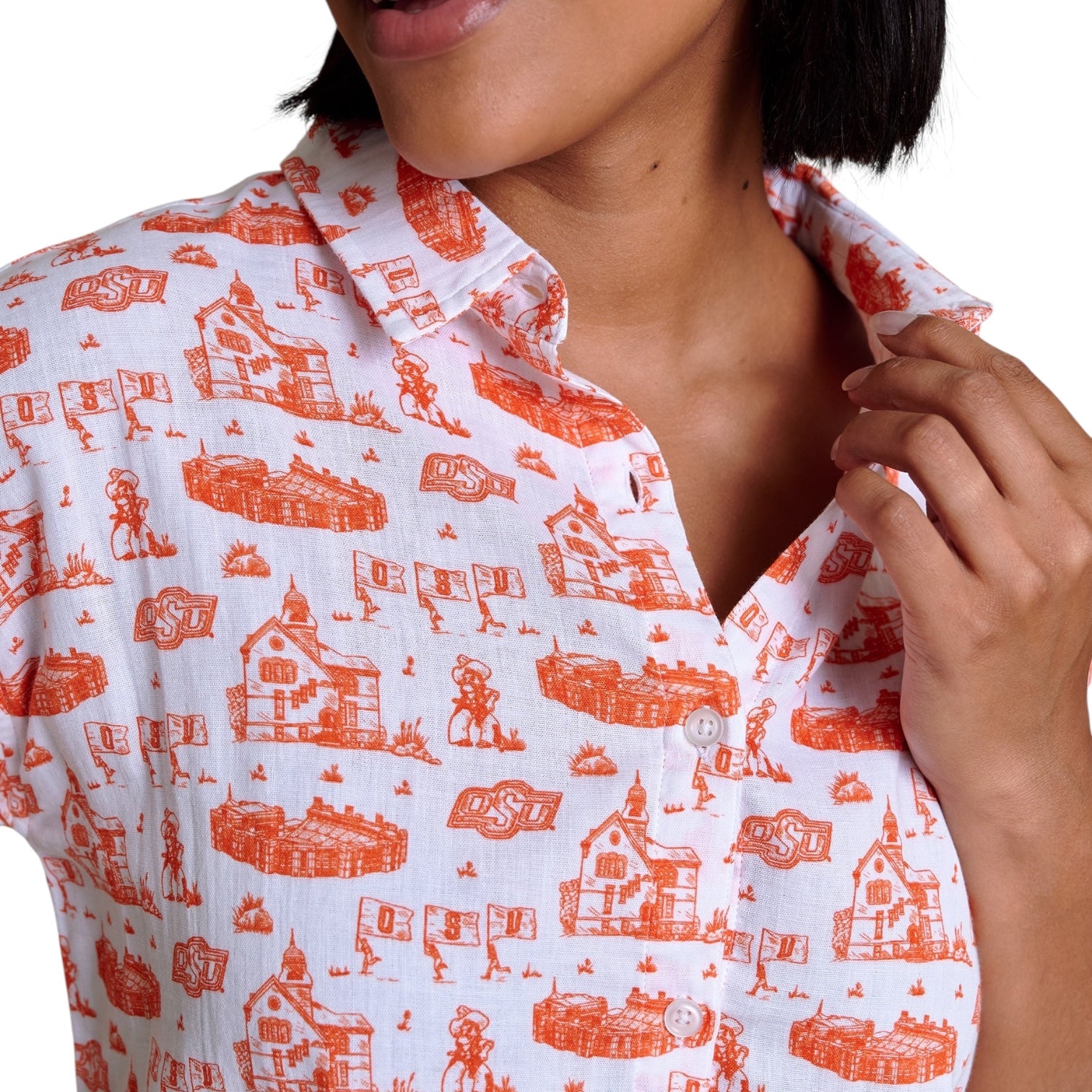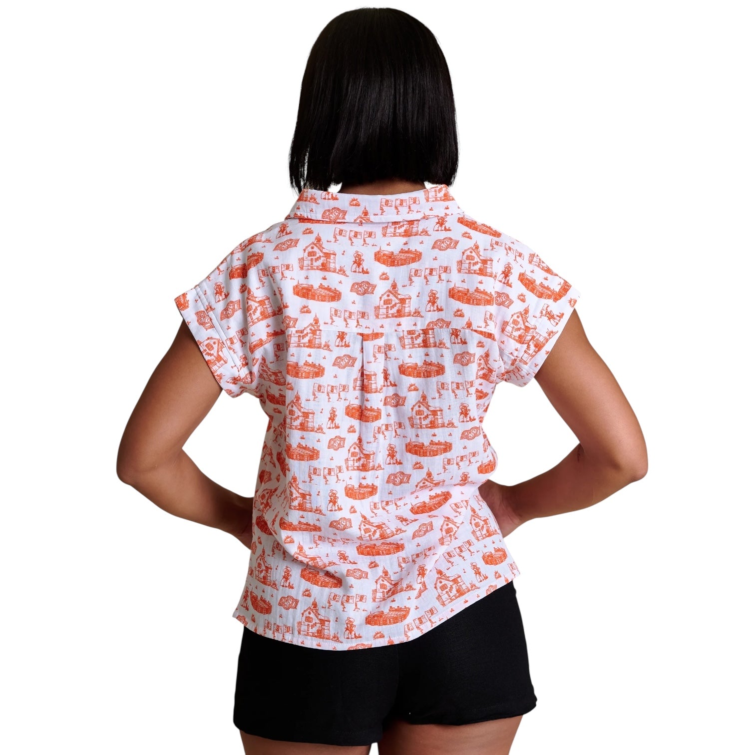 This lightweight cotton gauze button-up is anything but basic. Featuring our signature Team Toile print — complete with campus icons, mascots, and hometown highlights — it’s a collector’s piece disguised as an everyday essential. The cap sleeves with rolled cuffs and side slits keep the fit breezy and cool from kickoff to post-game.