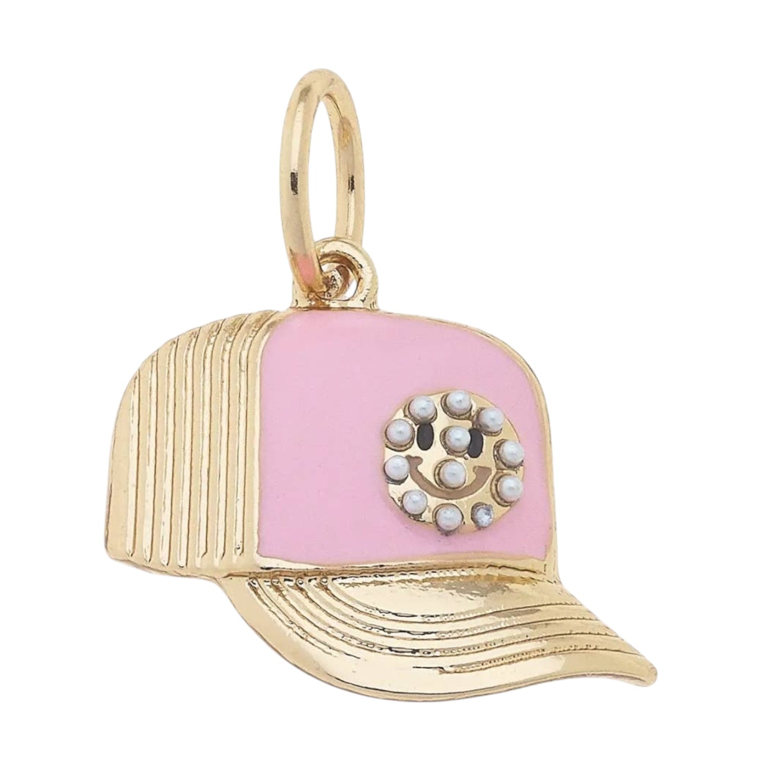 The Smiley Face Trucker Hat Charm in Light Pink features a light pink trucker hat with a happy smiley face. This charm adds a fun and casual vibe to your accessory collection.