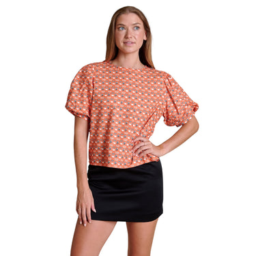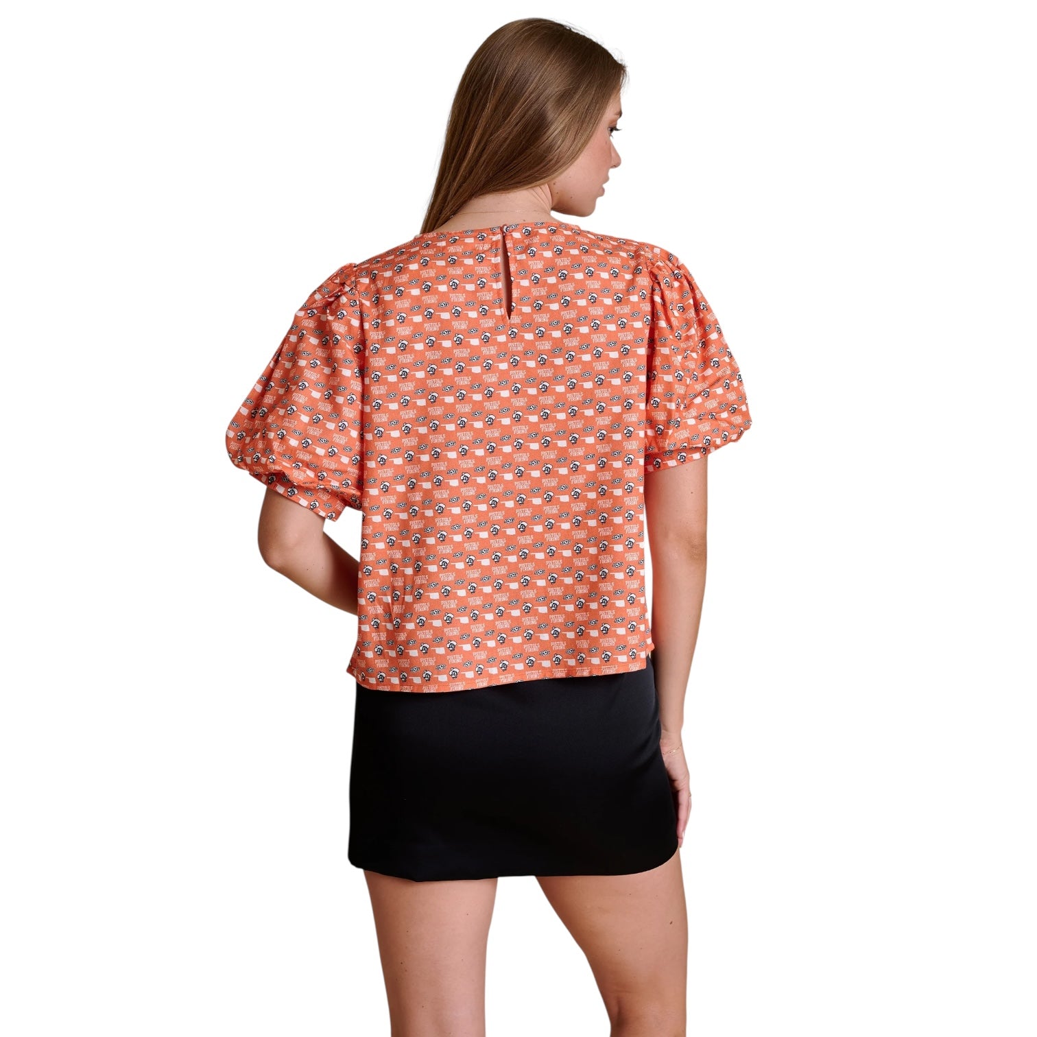 Polished but playful, this puff-sleeve blouse is made from our soft, brushed twill for elevated everyday wear. The keyhole back closure keeps things classic, while the all-over pattern of school logos, wordmarks, and state shapes adds a subtle, spirited detail. Whether tucked into denim or dressed up with a skirt, it’s a game day favorite made for chic fans.